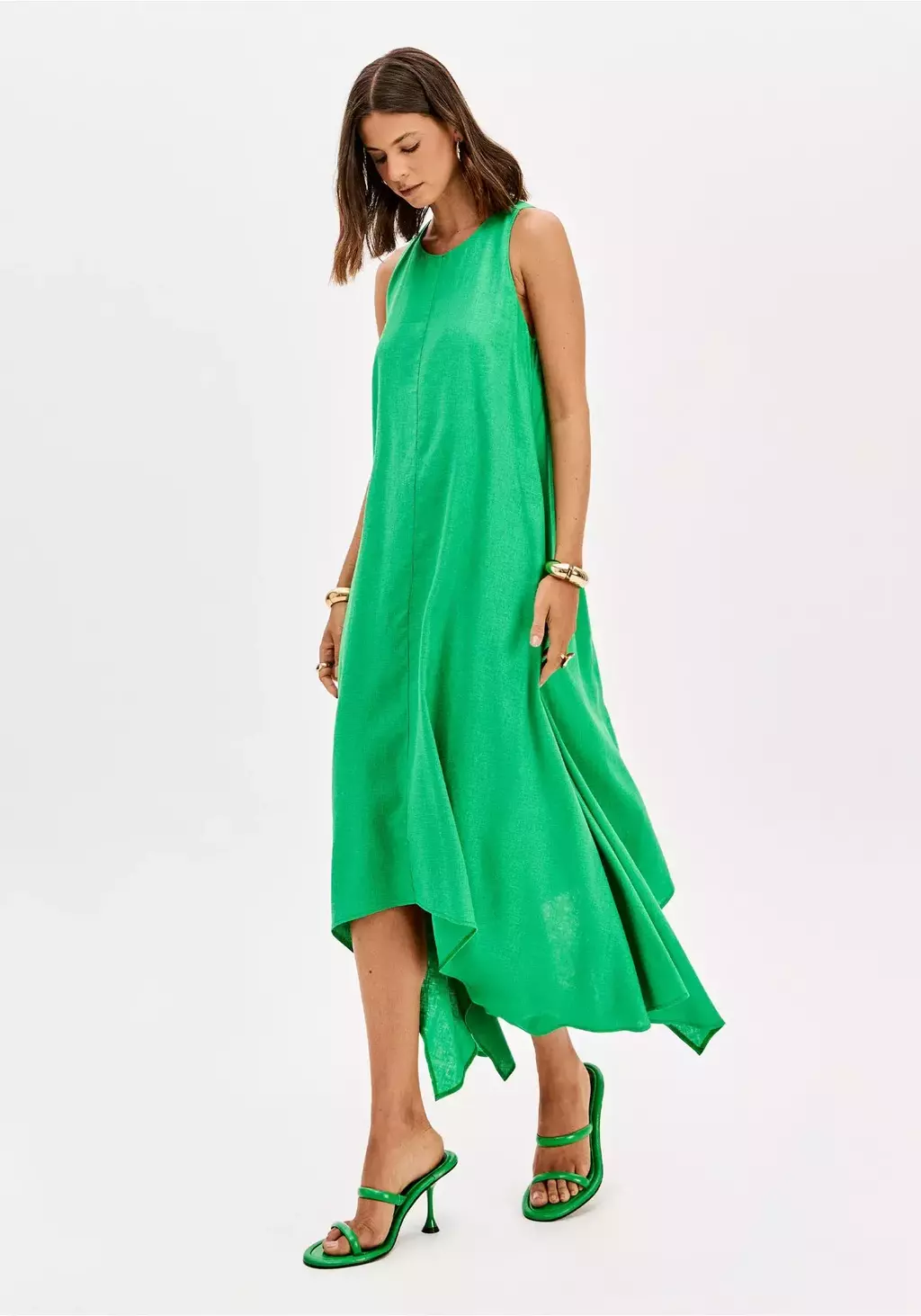Confeccionado em tecido com linho de visual sofisticado, o vestido super midi traz modelagem assimétrica que garante movimento e atualiza as produções. O decote redondo e o fechamento posterior por botão completam o modelo.